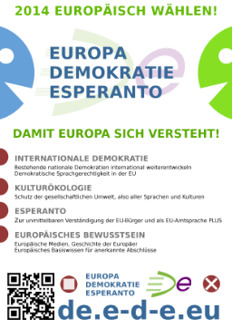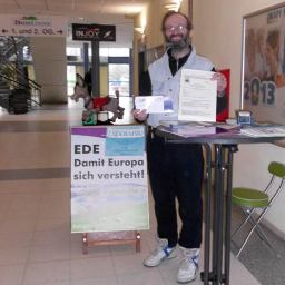 2019 ist wieder die Wahl des Europäischen Parlaments. Bisher hat EDE - Europa Demokratie Esperanto drei Mal an dieser Wahl teilgenommen ... in Frankreich. In Deutschland stand EDE, und damit praktisch Esperanto, nur 2009 auf dem Wahlzettel. Um wieder auf den Wahlzettel zu kommen, benötigt EDE wieder 4000 Unterschriften bis Ende Januar 2019. Wir haben bundesweit begonnen, Unterschriften zu sammeln. In vielen Städten gibt es schon AnsprechpartnerInnen (Dresden, Freiburg, Magdeburg, Berlin, Schwerin, Frankfurt/M., Halle/S. u.a.)