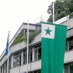 E-D-E war mit den Vorsitzenden aus Deutschland und Frankreich dabei! Vom 2. bis zum 5. Juni liefen Veranstaltungen unter dem Kongress-Motto "Krieg und Frieden". Hochaktuell, wenn man bedenkt, mit welchen Spannungen heute Völker, Kulturen und Menschen umgehen. Da passten wir mit unserer Fragestellung gut. Der Kongreß stand zudem im Zeichen Europas. Nicht nur die Esperantofahne hing diesmal vor dem Kongreßort. Am linken der drei Masten flatterte eine kleine Europafahne. Beim diesem Anblick kann man schon ins Träumen geraten. Von links nach rechts zuerst die Europafahne, dann die Demokratiefahne (die gibts noch nicht), sowie die Esperantofahne. Das zusätzliche nichtoffizielle E-D-E-Logo mit seinen drei Sternen macht die Idee deutlich.