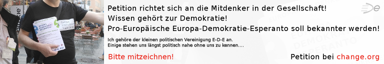 Seit wenigen Wochen versammeln sich sonntags 14:00 Pro-Europäer in den Städten. Für die Esperantisten allgemein, aber auch für uns Anhänger von Europa-Demokratie-Esperanto ist es ein erstaunlicher Vorgang, daß eine Idee in kurzer Zeit so Medienwirksam ist. Wie schwer ist es doch, Bürger für die Idee Esperanto, erst recht im Zusammenhang mit Europa aufzurütteln. Das dauert im Normalfall Generationen. E-D-E ist seit Jahren zeitgemäß und zeigt die Notwendigkeit der Nutzung unserer internationalen Sprache auf, damit ein Europa der Bürger wirklich entstehen kann. Das Problem des Zugehörigkeitsgefühls ist auch in Europa zu bedeutend, als daß man die Lösung einer Nationalsprache überlassen kann.